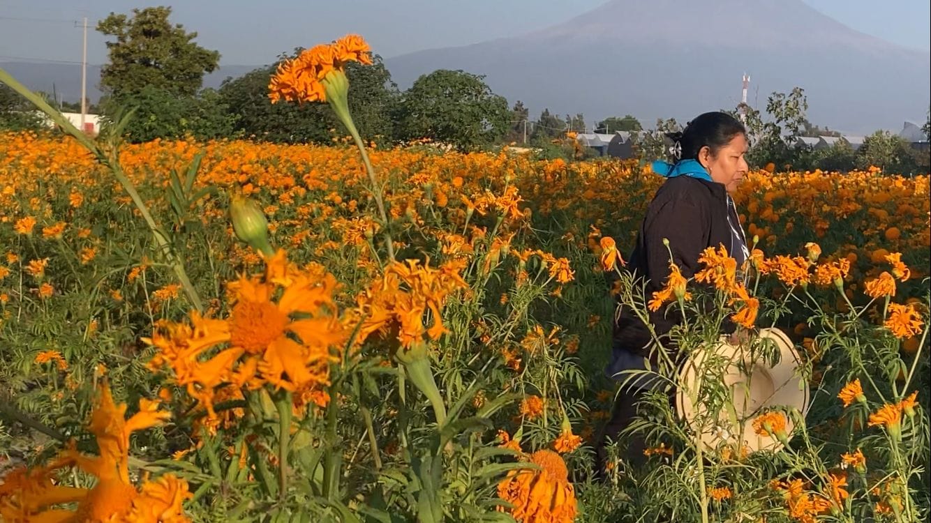 —La mañana aclara lentamente en Atlixco. Los primeros rayos del sol iluminan los campos cubiertos de cempasúchil y terciopelo, que forman un tapete natural y dorado al pie del imponente Popocatépetl. El aire huele a tierra húmeda y flor recién cortada. Es finales de octubre, y con ello, comienza una de las temporadas más esperadas del año: la venta de la flor de muerto.